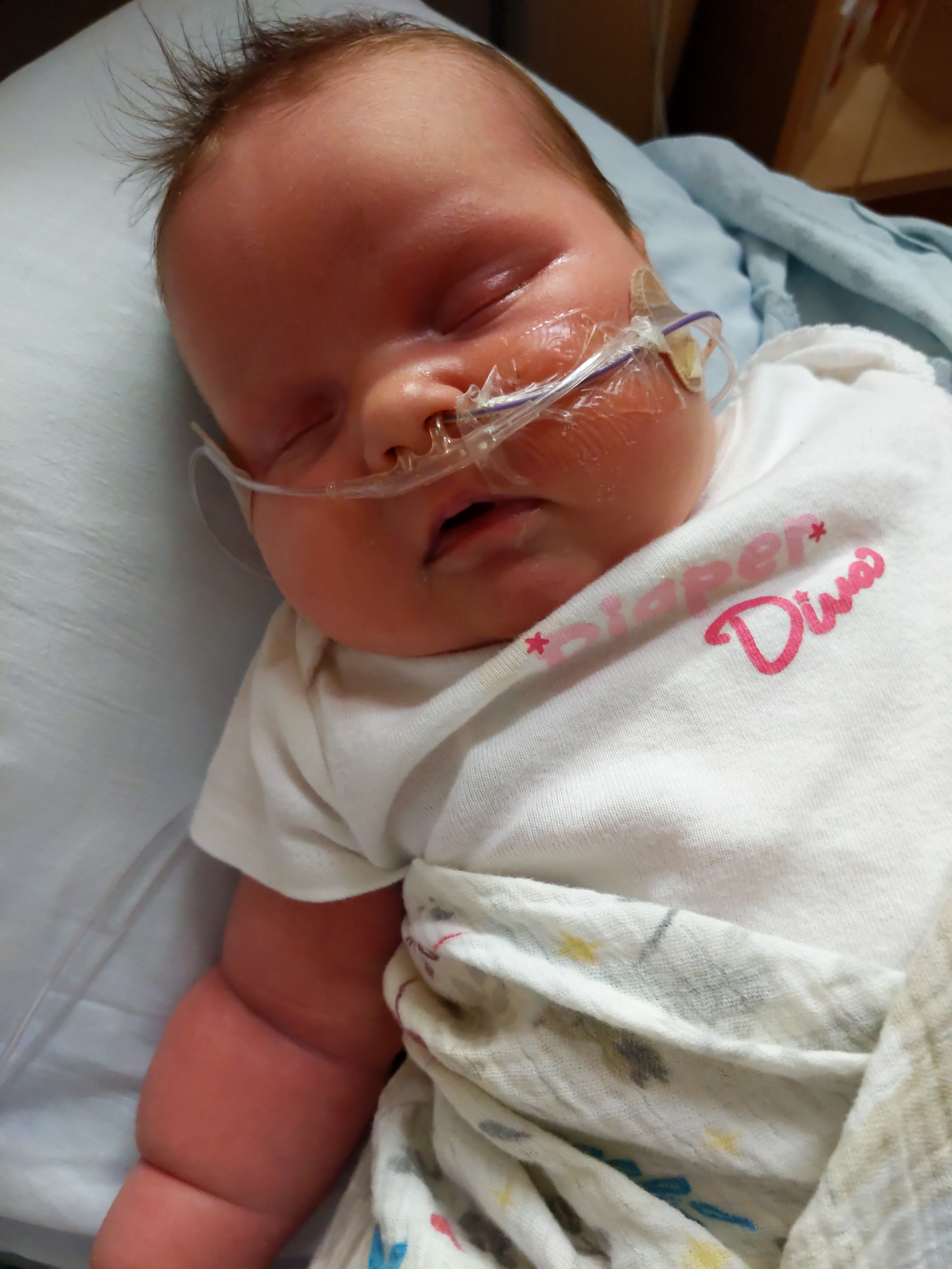 She went from being intubated and having an umbilical line in an incubator, to nasal oxygen and a feeding tube in a crib, and then to an ng feeding tube and no oxygen in a crib borrowed from the pediatric unit. She kept improving, but the progress was slow. At 42 weeks (age would-be gestation) we faced a choice: Take her home with the ng tube, or move her to pediatrics until she learns to eat better. We decided to take her home, and so trained to place the tube, make sure it’s in her stomach not her lungs, and feed her the right amount at the right speed. It was stressful, and though we were thrilled to have her home, I was afraid that I wouldn’t be able to take care of her as well as I needed to.